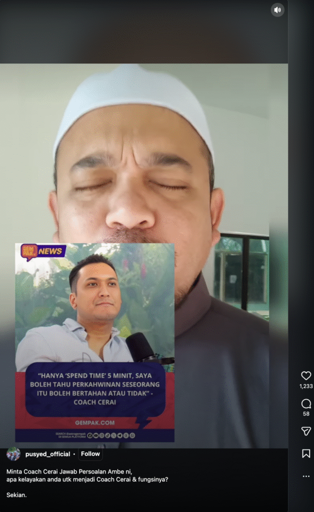 Menerusi perkongsian terbaharu, PU Syed atau nama penuhnya Syed Mohd Bakri Syed Ishak meluahkan rasa hairan terhadap kewujudan gelaran tersebut, terutama apabila individu berkenaan mendakwa hanya memerlukan sekitar lima minit untuk menilai sama ada sesebuah rumah tangga boleh diselamatkan atau perlu berakhir dengan perceraian.
