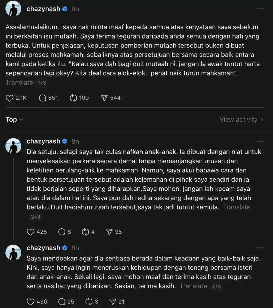 Pempengaruh media sosial Chazynash sekali lagi menjadi perhatian warganet apabila tampil memohon maaf secara terbuka susulan kenyataannya sebelum ini berkaitan isu mutaah kepada bekas isteri yang mencetuskan pelbagai reaksi.