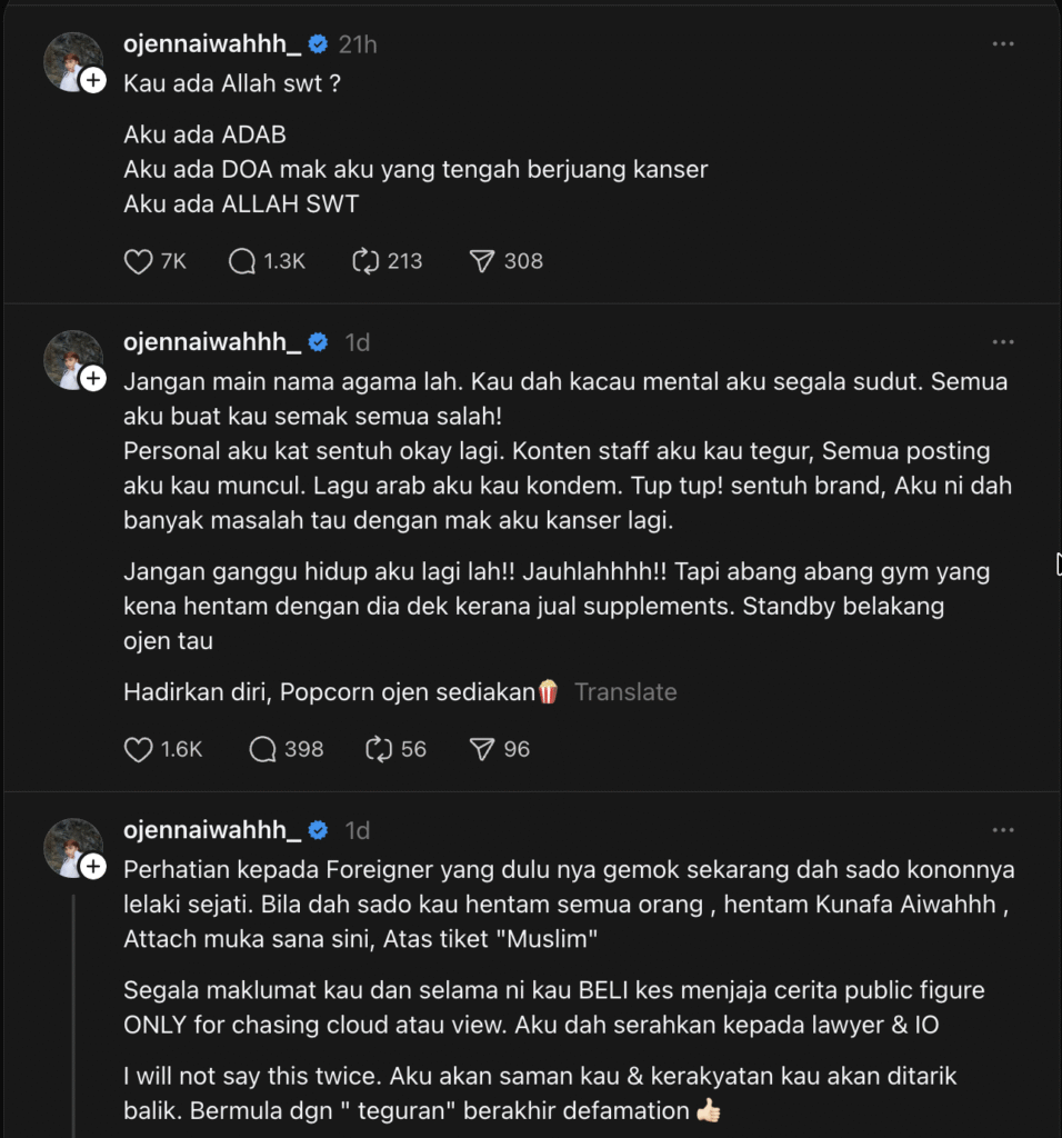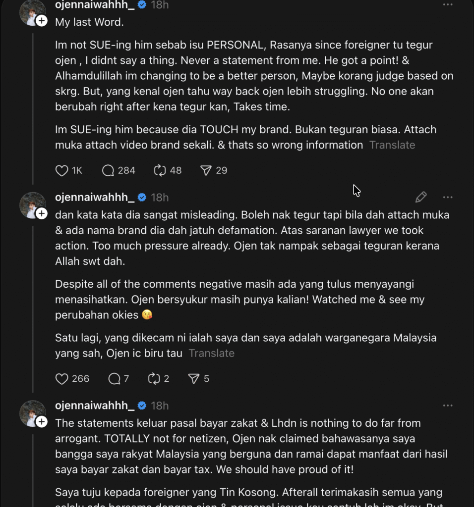 Ojen turut menjelaskan bahawa dia cuba berubah sedikit demi sedikit selepas ditegur, termasuk mula memakai topi, namun tidak bersetuju apabila kritikan tersebut berlarutan sehingga mengaitkan produk kunafanya sebagai tidak sihat dan mengarut. Bagi Ojen, itu sudah menjejaskan reputasi perniagaan yang dibina.