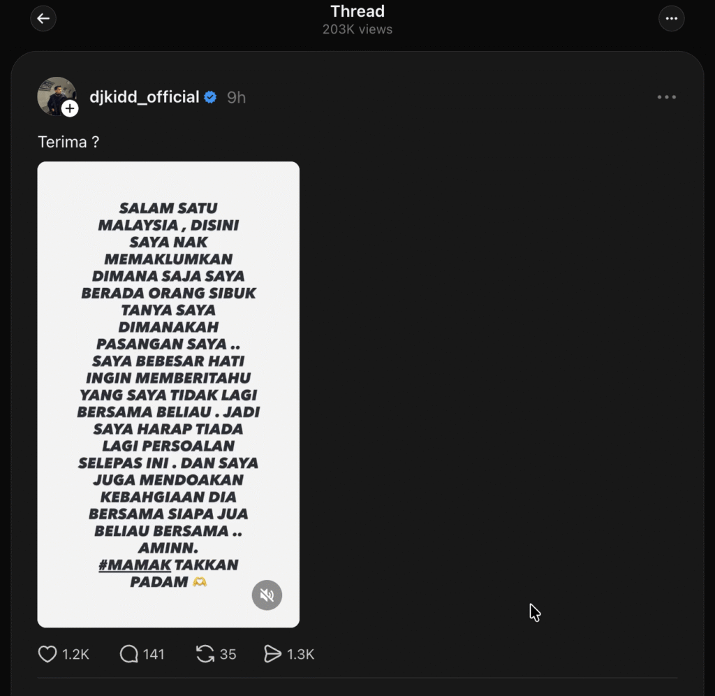 Menerusi satu hantaran di Threads awal pagi tadi, DJ Kidd memaklumkan bahawa dia kini sudah tidak lagi bersama pasangannya. Kenyataan itu dibuat selepas dia dihujani soalan daripada orang ramai yang asyik bertanya tentang teman wanitanya. “Di sini saya nak memaklumkan, di mana saja saya berada, orang sibuk tanya saya, di manakah pasangan saya. Saya berbesar hati ingin memberitahu yang saya tidak lagi bersama dia. Jadi saya harap tiada lagi persoalan selepas ini,” katanya.
