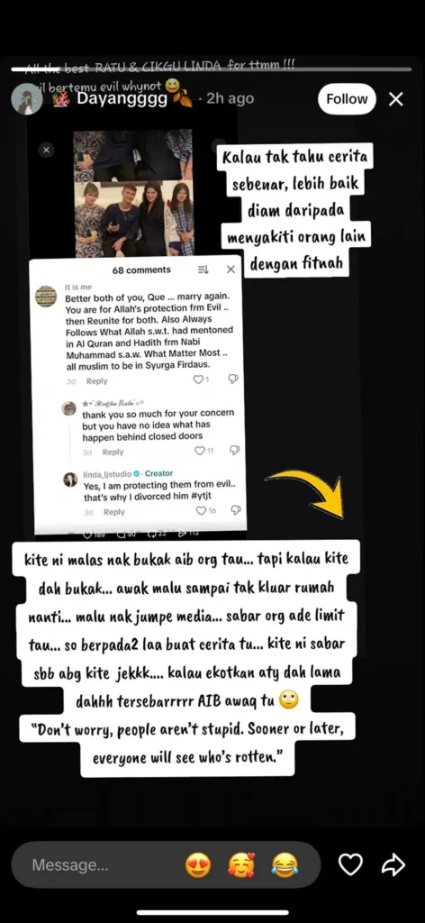 Sehingga kini, tiada penjelasan terperinci diberikan oleh mana-mana pihak mengenai situasi sebenar, namun sokongan daripada rakan artis dan keluarga jelas menunjukkan bahawa cerita di sebalik isu ini mungkin lebih kompleks daripada apa yang dilihat di permukaan.