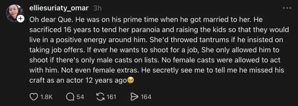 Ellie Suriaty pula mendedahkan bahawa Que sebenarnya berada di kemuncak kerjaya ketika mendirikan rumah tangga, namun memilih untuk mengutamakan keluarga. Lebih mengejutkan, beliau mendakwa Que berdepan kekangan dalam menerima tawaran lakonan dan tidak bebas bekerja seperti biasa, sekali gus menjelaskan kenapa pelakon itu seakan ‘hilang’ dari dunia seni untuk tempoh yang lama.
